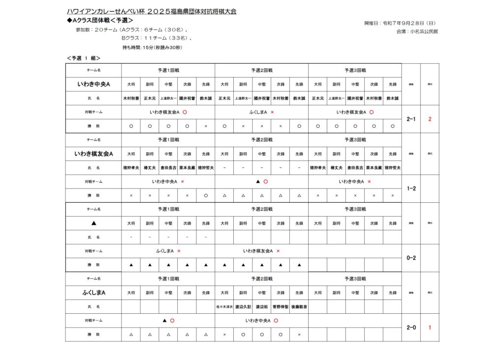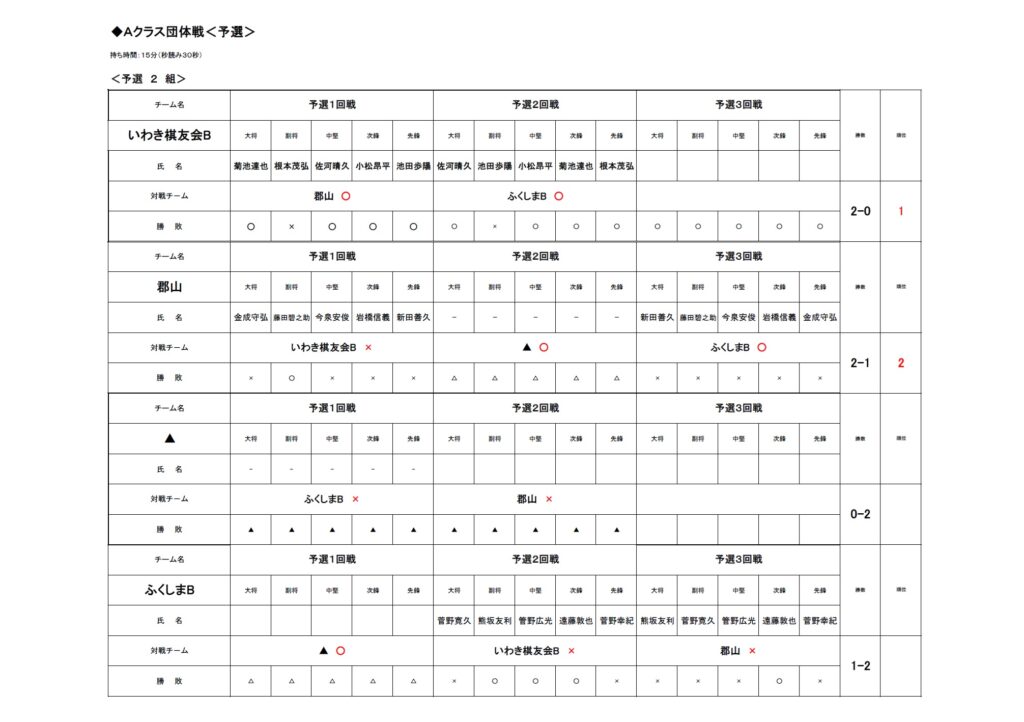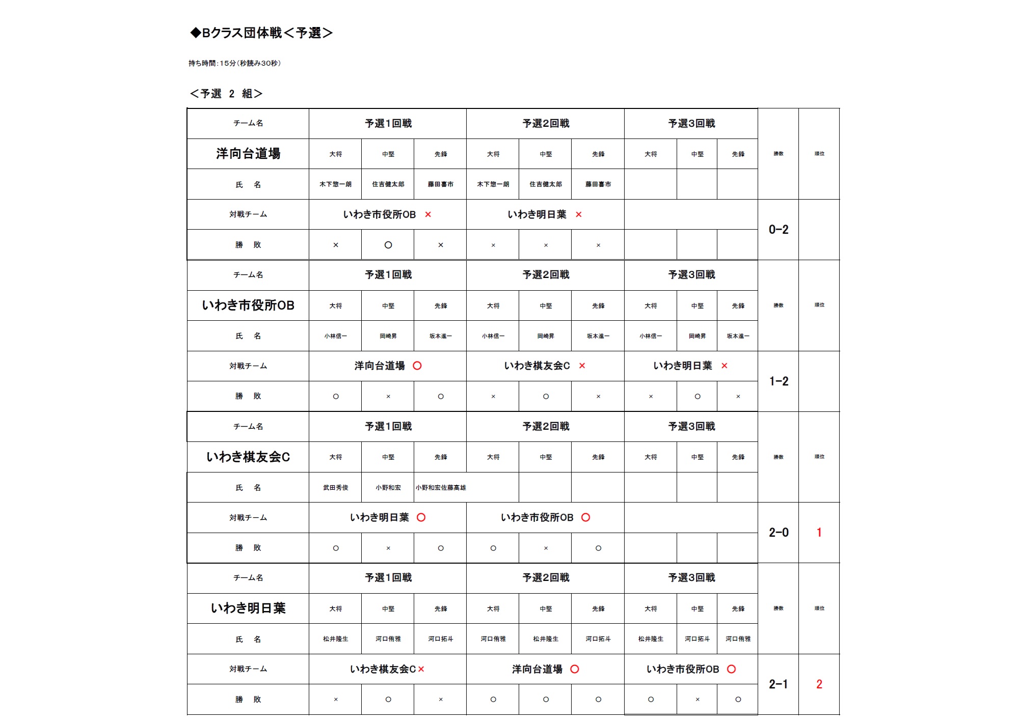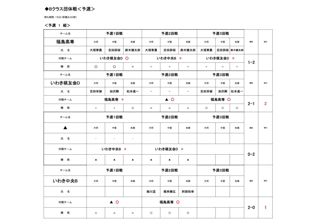 優 勝 | いわき棋友会B | 佐河晴久、小松昂平、池田歩陽、根本茂弘、菊池達也 |